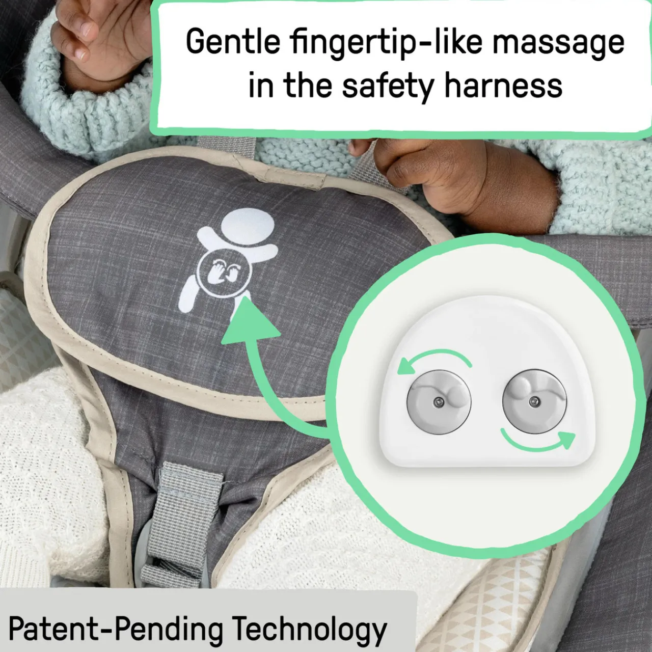 - The bouncer has belly massage technology offering a circular massage motion to help soothe baby and provide relief from discomfort.