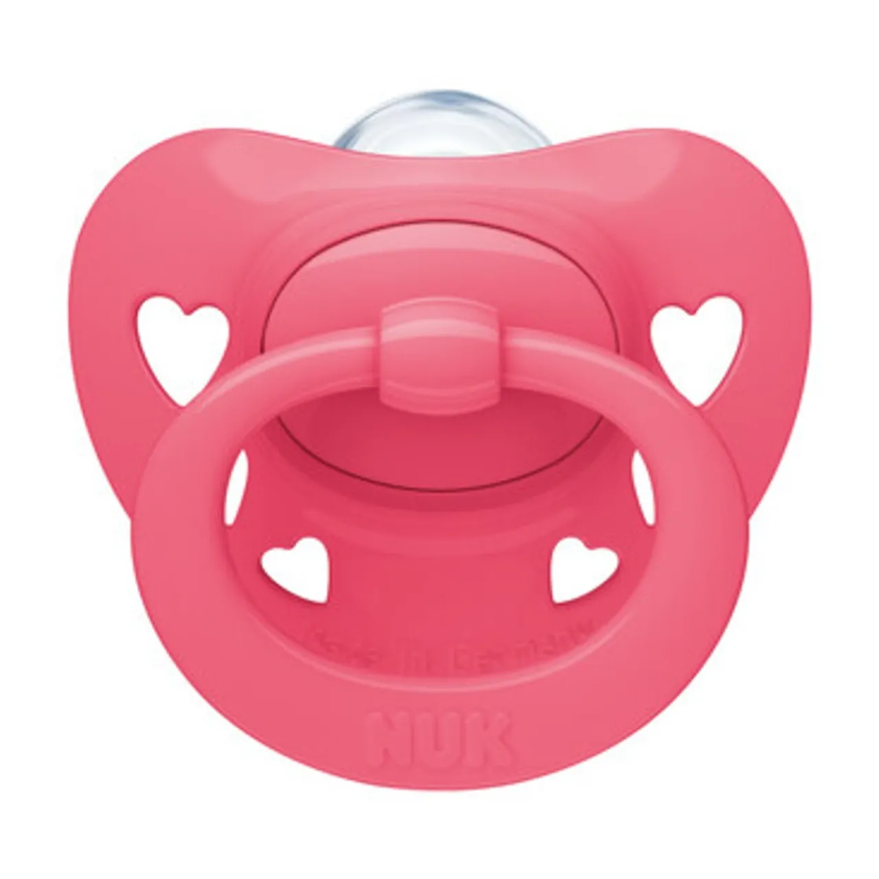 It is flat, thin and narrow and fits very well into little mouths and leaves the tongue enough space for natural sucking movements. 100% of orthodontists recognise that this is the right shape and confirm that NUK Soothers do not cause crooked teeth or jaw misalignment.*
