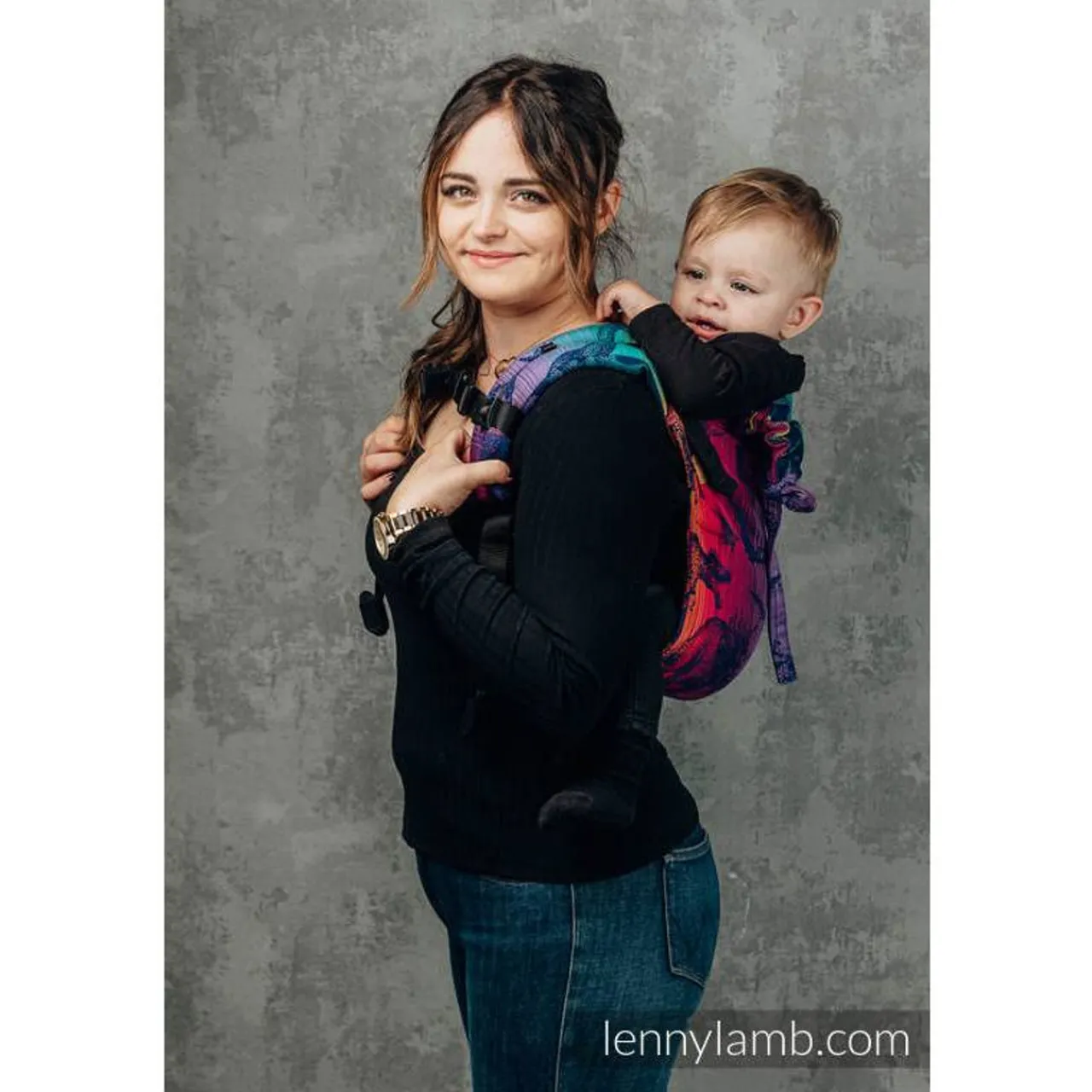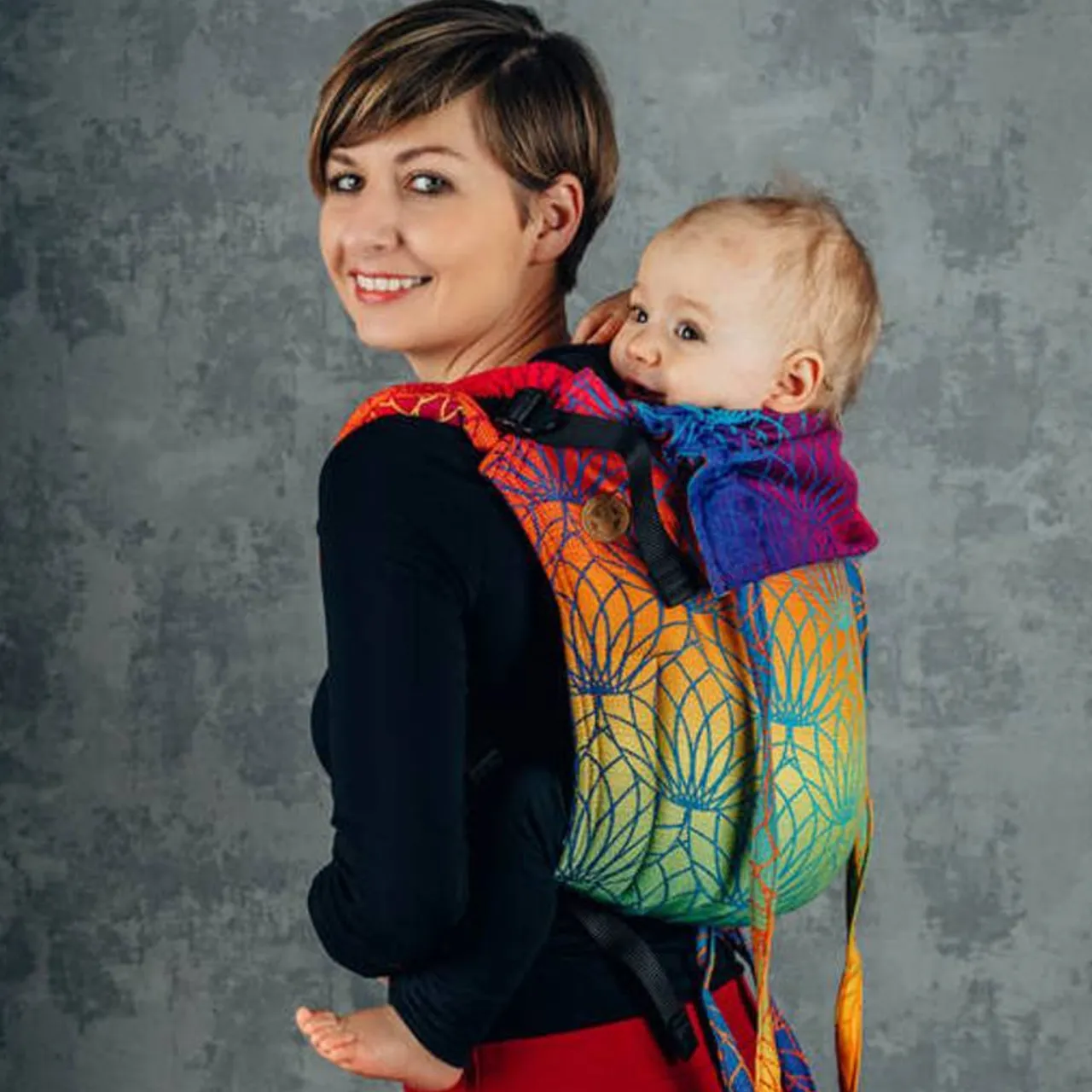 The very popular Onbuhimo range from Lenny Lamb is loved for the beautiful wrap conversion fabrics and the quick practicality of this carrier style. Onbuhimo are based on a traditional Japanese style carrier, where the legs are supported by the shoulder straps and there is no waist band. This gives a really high back carry, similar to a piggy back buthands free. An ideal carrying option for during pregnancy, as there is nothing across your bump.