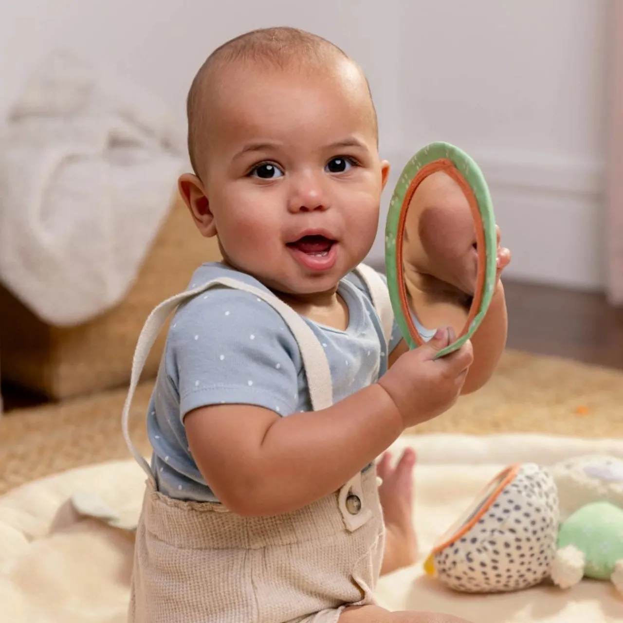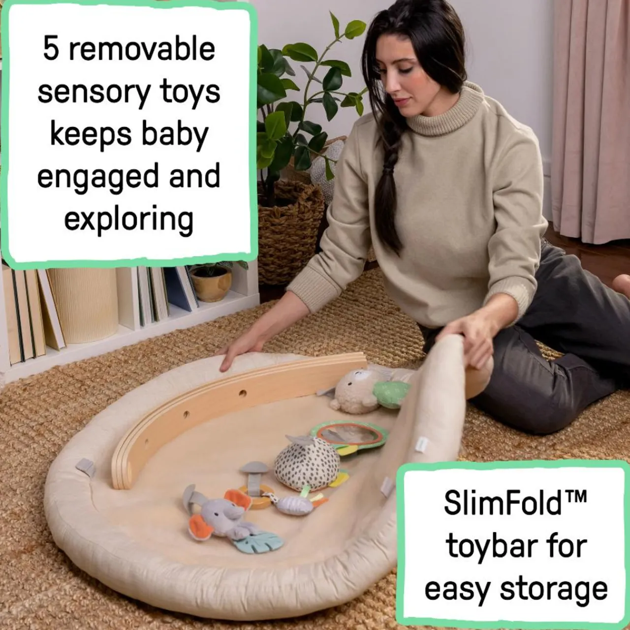 - A wooden SlimFold toy bar for easy removal and storage comes with 5 removable activity toys—sensory plush toy, textured toy, wood ring with sensory ribbon, and two mirrored toys— to encourage baby to stretch, explore, and play
