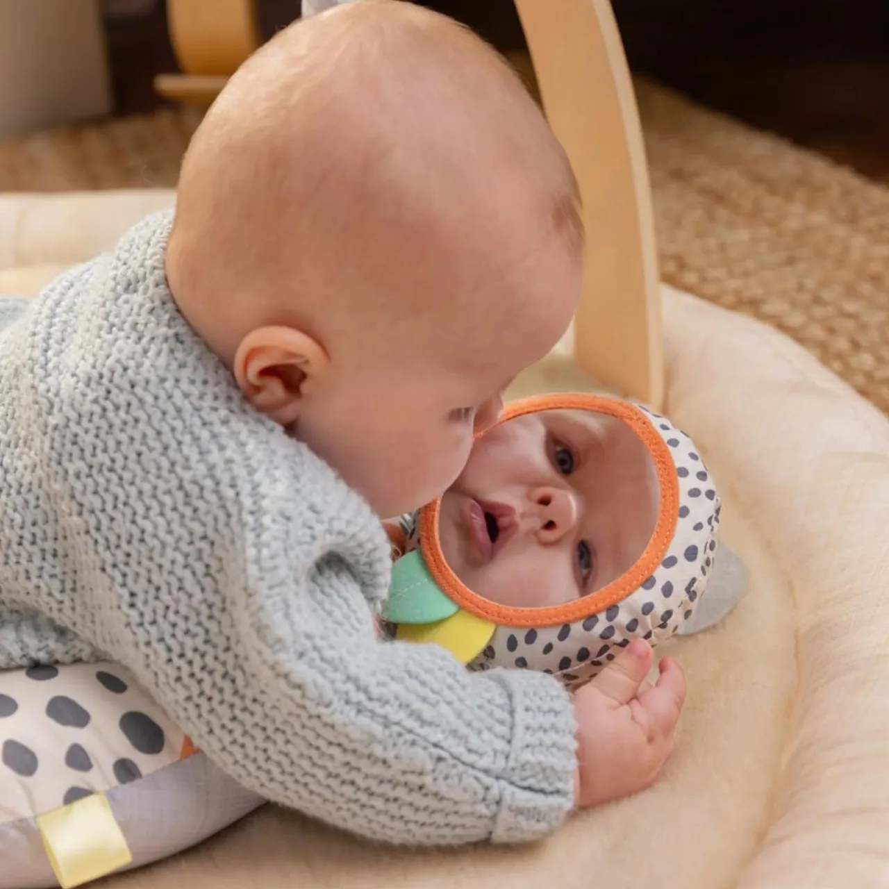 - The toys and materials used for this gym were chosen specifically for the first year of baby’s life, to help with their visual and tacticle development. An included tummy time pillow supports baby as they spend time on their stomach