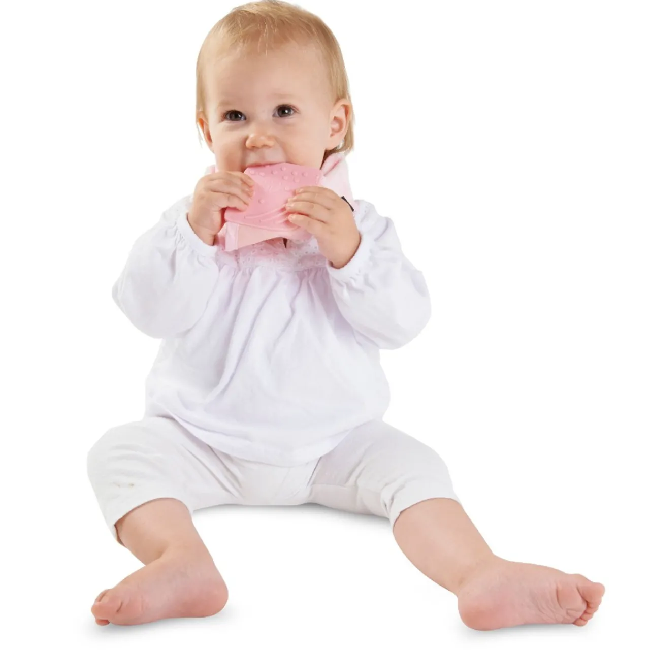 - Attached teether for gum relief